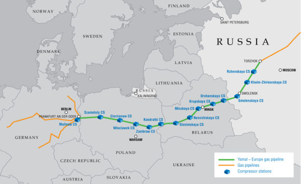 1. the Yamal-Europe gas pipeline that runs via Belarus and Poland to Germany. Its capacity is about 34 bcm a year;