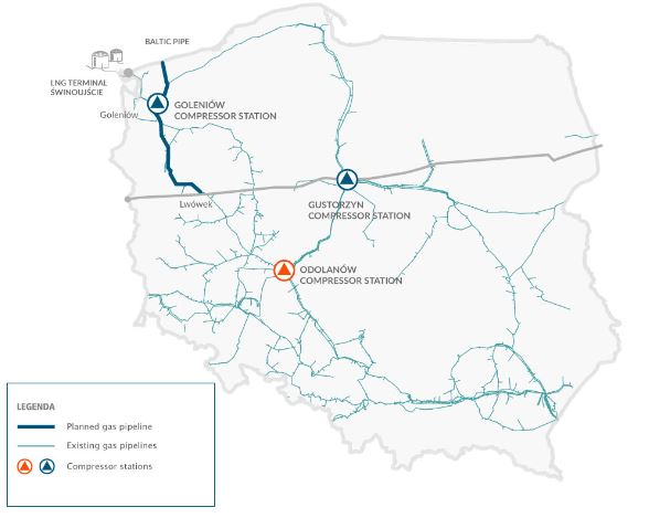 The expansion of the Odolanów compressor station is part of preparations for the launch of the Baltic Pipe gas pipeline from Norway. Gaz-System states that it will allow for “increasing the capacity of the transmission system by pumping larger amounts of gas from the Baltic Pipe offshore gas pipeline. It will make it possible to increase Poland’s energy security and will constitute an important element of the North-South Corridor. ” The expansion is to be completed as scheduled in the third quarter of 2022. Baltic Pipe is to be ready by October 2022.